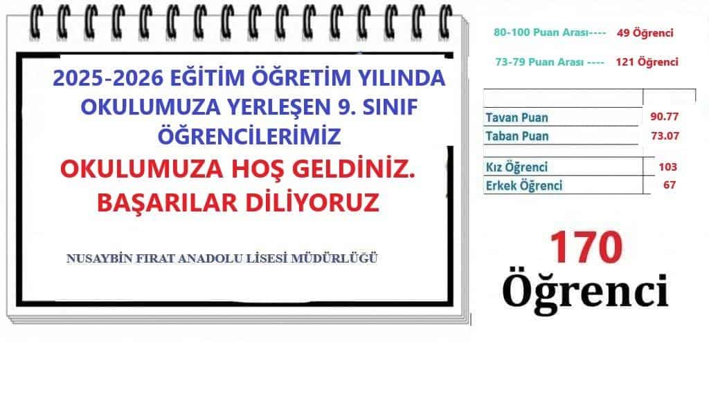 2025-2026 Eğitim öğretim yılında 14 Ağustos 2025 tarihi itibariyle yerel yerleştirme sonucunda okulumuza 170 öğrenci kaydı gerçekleşmiştir. Okulumuza yerleşen öğrencilerimizi tebrik ediyoruz.